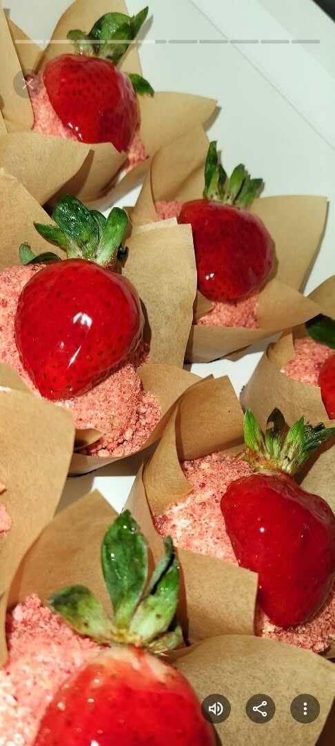 Ode to New York! Strawberry cake stuffed with strawberry compote, topped with cream cheese frosting, strawberry crunch coating & a fresh glazed strawberry
